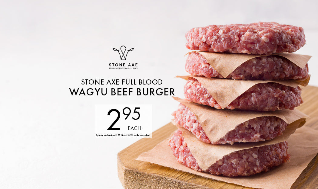 Our skilled in house butchers make these burger patties by hand every morning. We use Stone Axe Full Blood Wagyu Beef and our own mixture of fresh herbs and spices to make a rich, buttery and fantastically textured burger pattie. Revered on menus around the globe, multi award-winning Stone Axe Wagyu represents some of Australia’s finest beef. The Stone Axe brand is an ultra-premium, luxury Wagyu product, without exception.