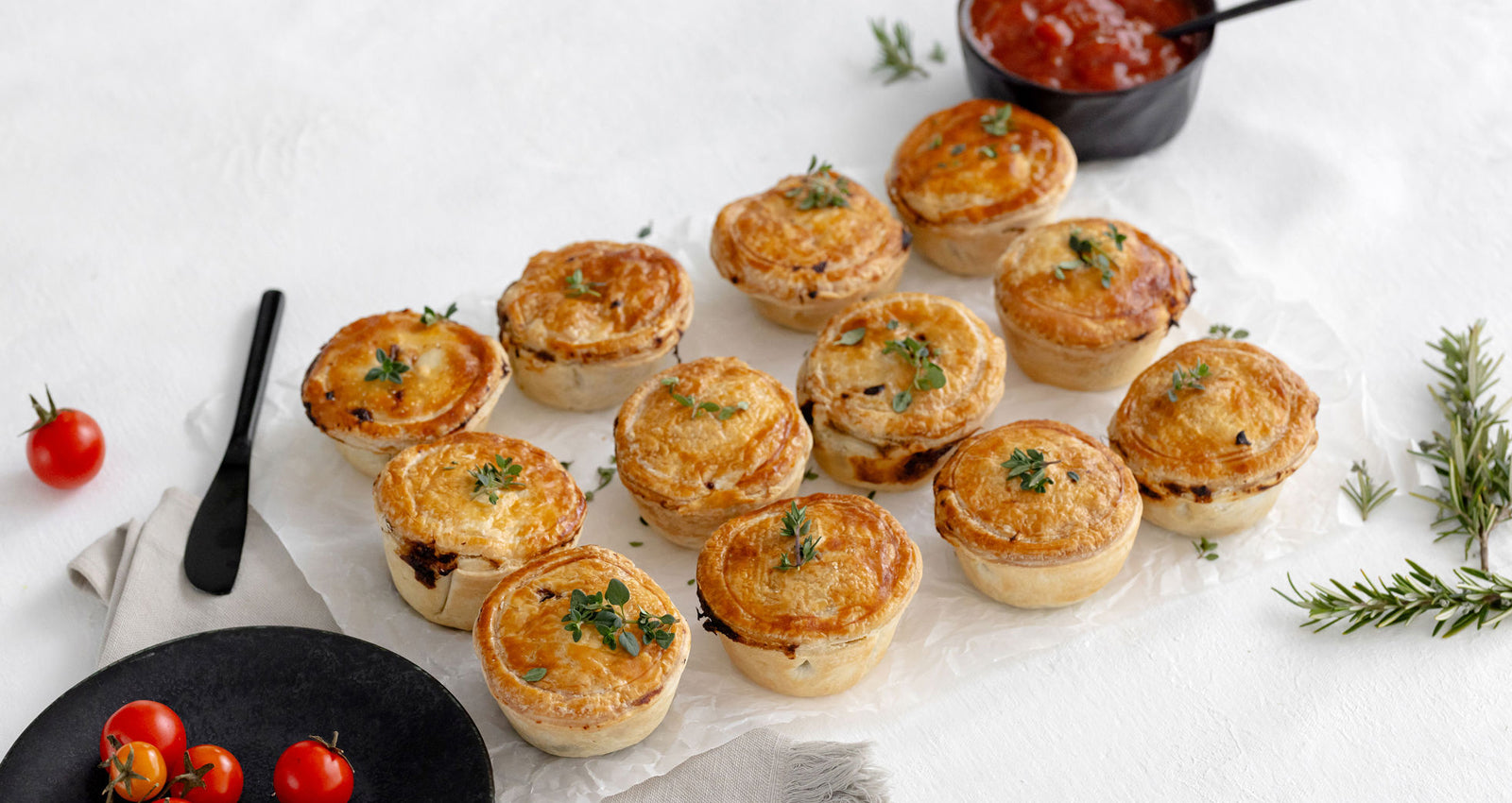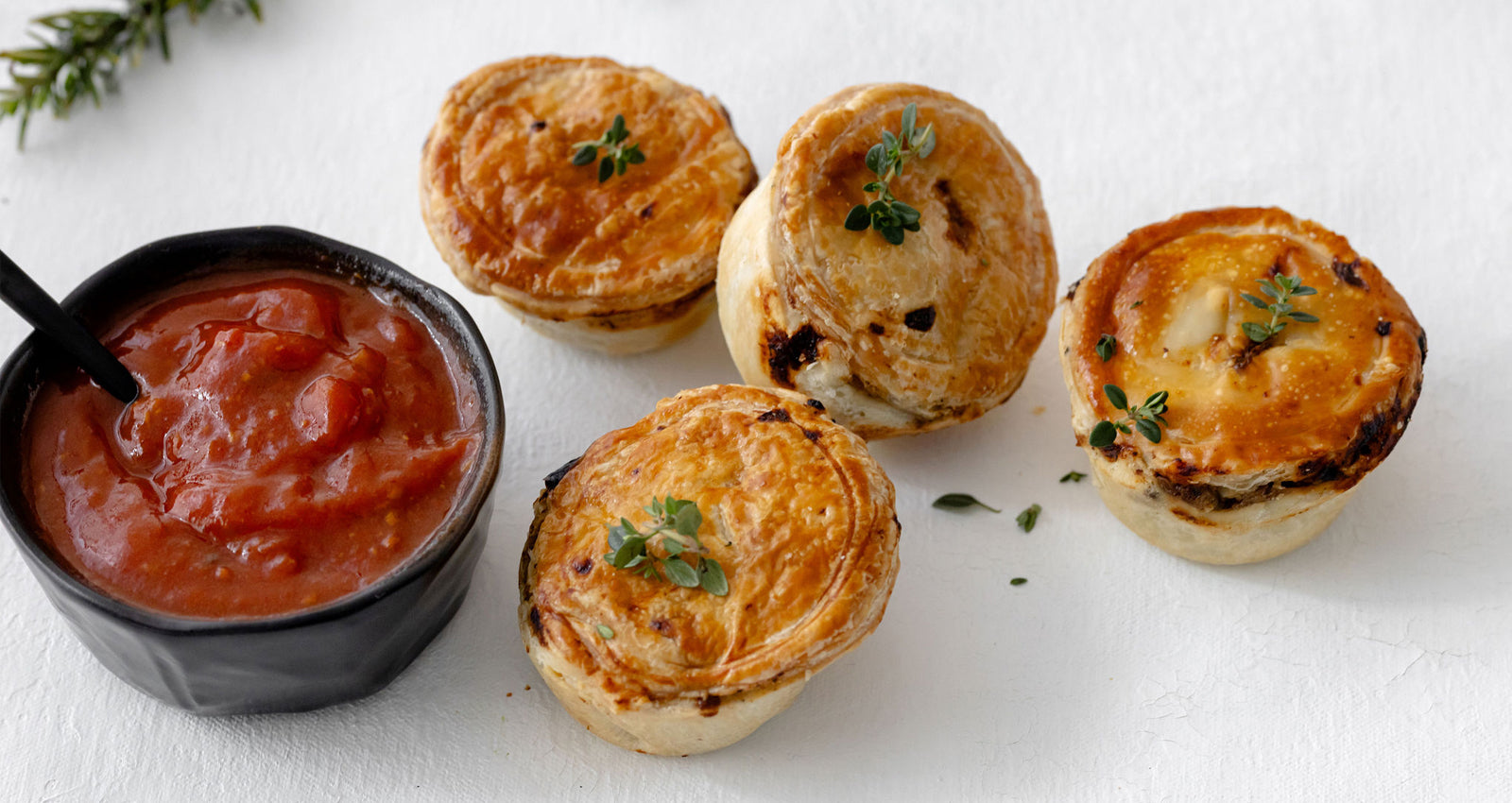 Elevate your dining experience with our luxury mini pies, showcasing tender premium Wagyu beef slow-cooked to perfection in a rich red wine sauce. Each pie is encased in a flaky, golden puff pastry and served with a vibrant, zesty tomato relish that enhances every bite.