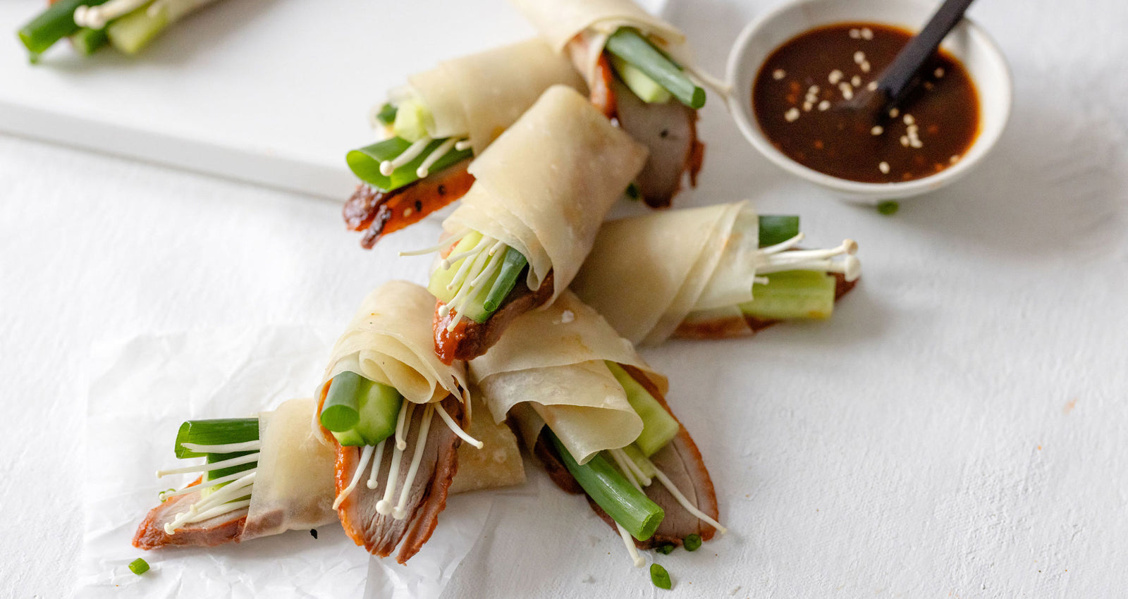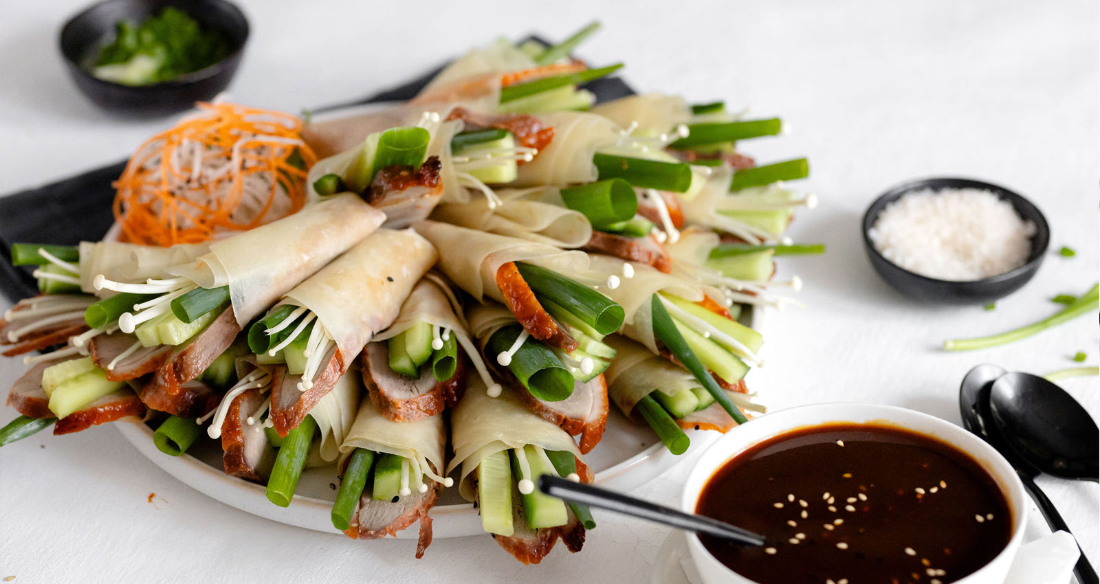 Peking duck pancakes filled with Peking duck, hoisin sauce and crunchy cucumbers. Served with Hoisin dipping sauce.