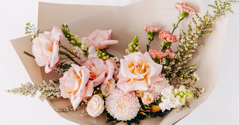 In shades of petal soft pink, these delicate roses and accompanying florals are a feminine classic. Bouquet pictured is a $145 bunch. Specific flowers within the bunch may vary due to availability.